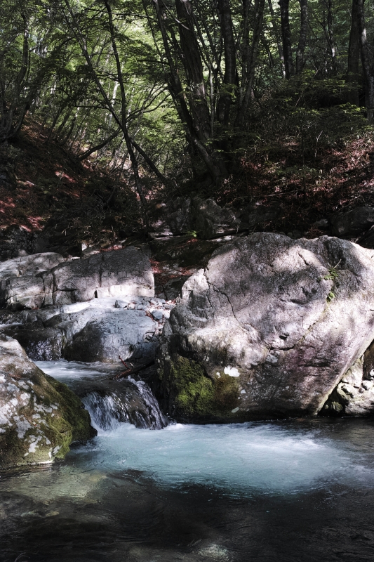 光と陰のコントラストが美しい谷では、春蟬が鳴き始めていた。